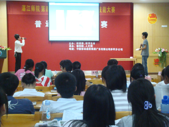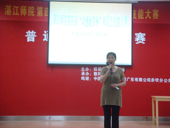 湛师新闻网5月24日讯 昨晚,由我校团委主办,人文学院和数科院联合承办的第四届“动感地带杯”师范生技能大赛之普通话技能大赛决赛于大学生活动中心学术报告厅举行。人文学院党委谢应明书记,数科院唐洪浪副书记,人文学院辅导员黄河、谢明亮老师出席了比赛。大赛邀请国家普通话一级测试员刘瑞芳教授、省级普通话测试员陈宗林教授和数科院崔静老师担任评委。