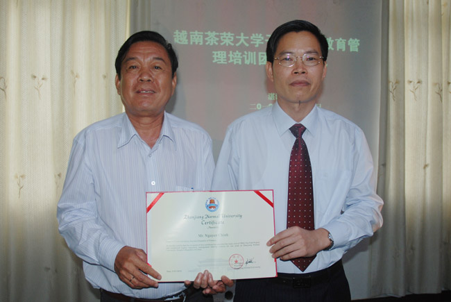 接着,茶荣大学林文白副校长作为学员代表感谢我院我本次培训所做的细致的安排和周到的接待。他表示,在培训中,他们有很大的收获,因为中国与越南的国情相似,利于两校的互相学习,有助于促进两校老师与学生的交流与合作。他感谢我院给他们提供可以参观湛江的美景、了解湛江和中国文化的机会,特别是能够品尝独特中国菜的机会,感谢我院在住宿、参观、培训等方面提供的帮助。林副校长真诚地希望我院领导和老师能到茶荣大学进行交流,并期待两校有更好的合作与交流。