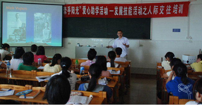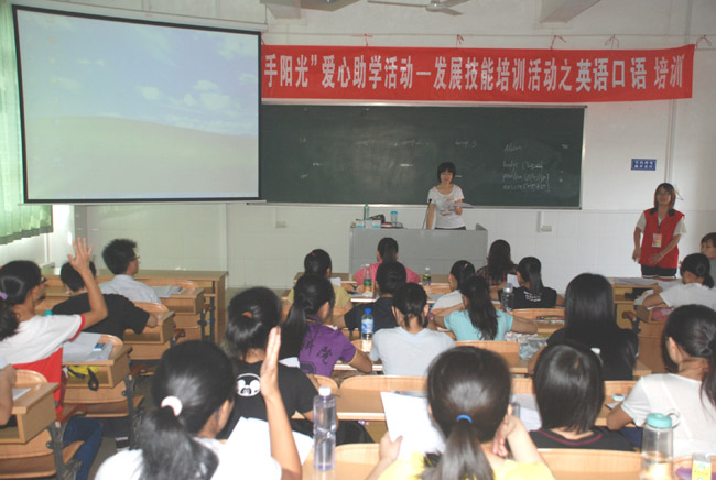 截至今日,“牵手阳光”技能培训活动已开展了计算机培训、学习速记培训、说课培训、英语口语培训、普通话培训、人际交往培训六项技能培训项目,培训的形式丰富多样,有课堂讲授、课堂示范、互动教学、游戏体验等。”