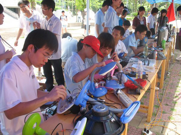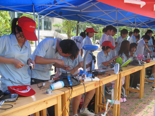 活动当天烈日炎炎,志愿者们为同学们维修有故障的电子产品,吸引了同学前来观看,他们为同学免费维修台灯、风扇、耳机、电脑等电子产品。