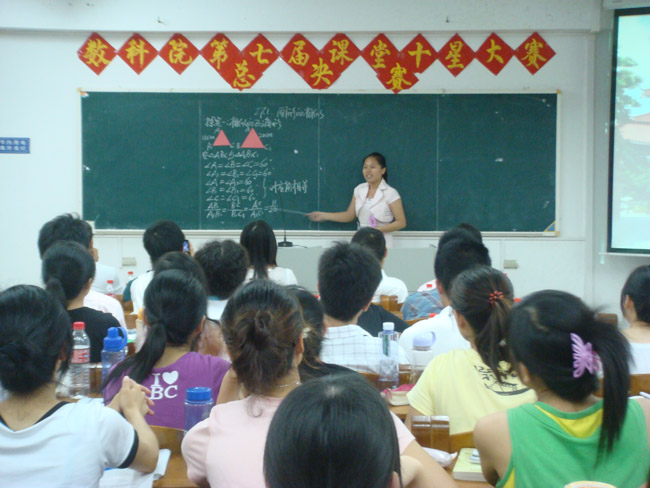 比赛中,选手们所讲的内容都出自中学新课标的数学知识。本次比赛采取多媒体教学和以往的传统教学方式相结合。经过初赛、复赛选拨出的10名选手通过生活中的实例,运用多种数学模型来丰富授课形式。选手们的精彩表现赢得了同学们的阵阵掌声,课堂气氛相当活跃。参赛者还利用提问、答辩等形式与现场的学生进行交流和互动,达到了很好地教学效果。