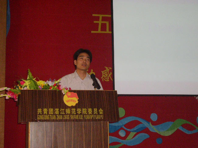 嘹亮的团歌响起过后,大会正式拉开帷幕。首先,钟明杰副书记讲话,宣布表彰决议,并寄望获奖的同学继续努力。其中,吴苗苗同学获得湛江市优秀共青团员称号,07化本1团支部、07化本2团支部等6个团支部获得湛江师范学院先进团支部称号。另外,还有若干同学获得优秀团干,优秀团员,优秀志愿者称号。