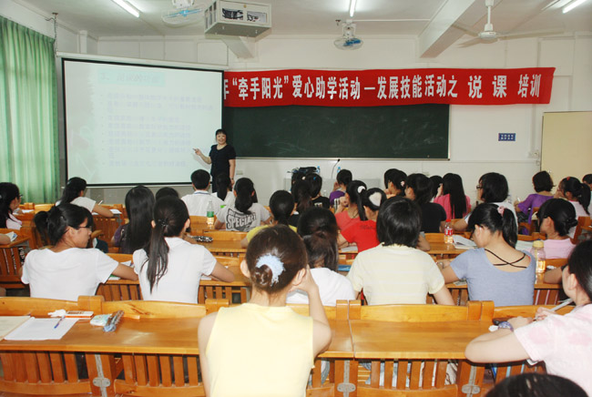 说课培训:作为一名师范生,将来的就业大部分是从事教育工作,而作为教师,必不可缺的就是说课技能。16日上午,由教科院白彦茹教授主讲的说课技能培训在教四805教室开展,共100多名贫困生参加了培训。白教授主要从说课的内容,如何撰写、类型与模式、原则和方法、应注意的问题等方面着手,有条不紊地讲授说课的理论知识,并强调说课应做到“有情、有序、有理、有效”。同时白教授还邀请去年学校说课比赛一等奖获得者——06级的陈白莲同学到现场为同学们进行了精彩的说课演示。