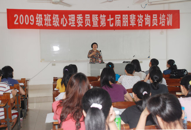 湛师新闻网5月17日讯 5月15日,我校心理咨询中心在宏雷楼810教室举办了2009级班级心理委员暨第七届朋辈咨询员培训班。校党委张兰英副书记、学生处赫云鹏副处长、心理咨询中心武慧多和黄丹媚老师出席了培训。培训由武慧多老师主持。