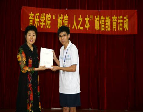 活动开始,音乐学院谢锦江辅导员发表讲话。谢老师强调诚信是我们大学生必备的素质、应有的态度,也是我们以后成功走向社会并立足于社会的基础,要求我们要以诚信对待身边事、做一个讲诚信的优秀大学生。