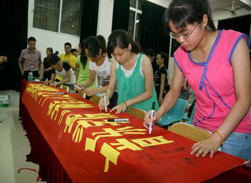 接着,在场的贷款生观看了“贫困大学生拖欠贷款社会调查”道德追问视屏,使同学们明白了诚信、按时还款的重要性。随后,贷款生代表蔡雪清讲述了她个人的经历,感人肺腑,用事实说明了国家助学贷款政策给了贫困学生继续学习的机会,号召我们要心怀感恩之心,按时偿还贷款。然后同学们郑重地签上自己的名字,立下了诚信之诺言。