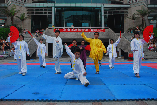 随着响亮雄浑的鼓声响起,中国传统艺术醒狮表演拉开了“精武会”的序幕。我校的《卧虎藏龙》、《龙腾虎跃》、《太极扇》等节目,富有活力和激情。翻腾的跟斗、完美弧度的跳跃、无懈可击的套路、流畅熟练的动作,展现出了表演者的精湛武艺。小品《逃课无间道》以其特有的诙谐幽默,引得现场观众捧腹大笑的同时,它所蕴含的深刻意义同样耐人寻味。健美操表演《活力四射》以其欢快的节奏、无限的激情与活力,将活动推向了高潮。最后,跆拳道表演《龙飞凤舞》,以其严谨的组织、高超的技艺给观众留下了深刻的印象。此次“精武会”活动场面火爆,吸引了大批观众驻足观看。