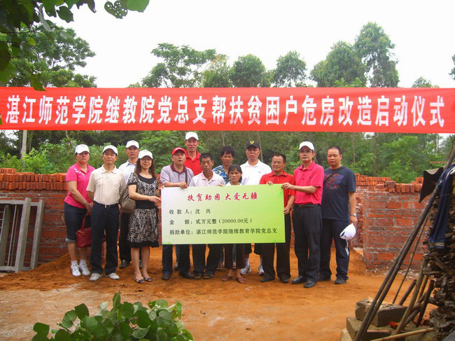 湛师新闻网5月10日讯 5月7日,继续教育学院党总支全体党员、重点培养对象在继续教育学院林艳萍书记的带领下,到徐闻县锦和镇金门村,看望了该院党总支结对帮扶的贫困对象沈兴一家。该院向沈兴送出慰问金200元,并捐赠危房改造资金两万元,正式启动了帮扶贫困户稳定脱贫计划中的危房改造工作。