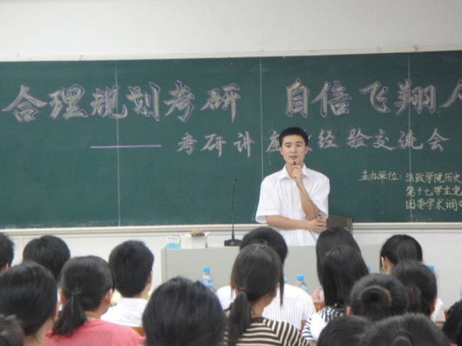 随后,蔡宏华、韦桂花、杨静等7位今年考研成功的同学结合自己的考研经验,分别从专业复习、英语复习、复试准备、心态调整等方面与现场同学分享了自己的考研心得。