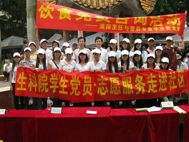 湛师新闻网5月5日讯 为了纪念五四运动91周年,昨天,生科院烹饪专业学生党支部在赤坎步行街的街心公园青少年亭开展了以“党员志愿者,奉献在社会”暨“健康生活,饮食作主”为主题的营养咨询志愿活动。辅导员欧阳乐军、刘锴栋老师也随队参加了活动。