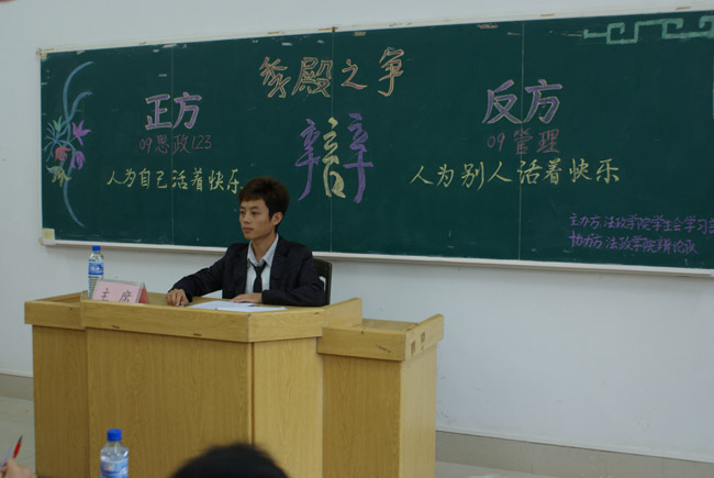 比赛伊始,一路过关砍将成功晋级季殿争夺赛的正方09思政1、2、3班代表队和反方09管理代表队围绕“为自己还是为别人活着快乐”展开了一轮激烈精彩的巅峰之战。辩手们在开篇立论、盆问小结、自由人对话、自由辩论、智囊团提问、总结陈词以及现场观众提问等环节中,紧扣辩题,你来我往,语言犀利,妙语连珠,引经据典,旁征博引,辩论激烈而又不失诙谐幽默,赢得现场观众的阵阵掌声。最后,正方09思政1、2、3班代表队以摘得季冠,09管理代表队夺得殿军。而正方四号辩手09思政1、2、3班代表队的孙祝凯同学获得此次辩论赛的最佳辩手奖。