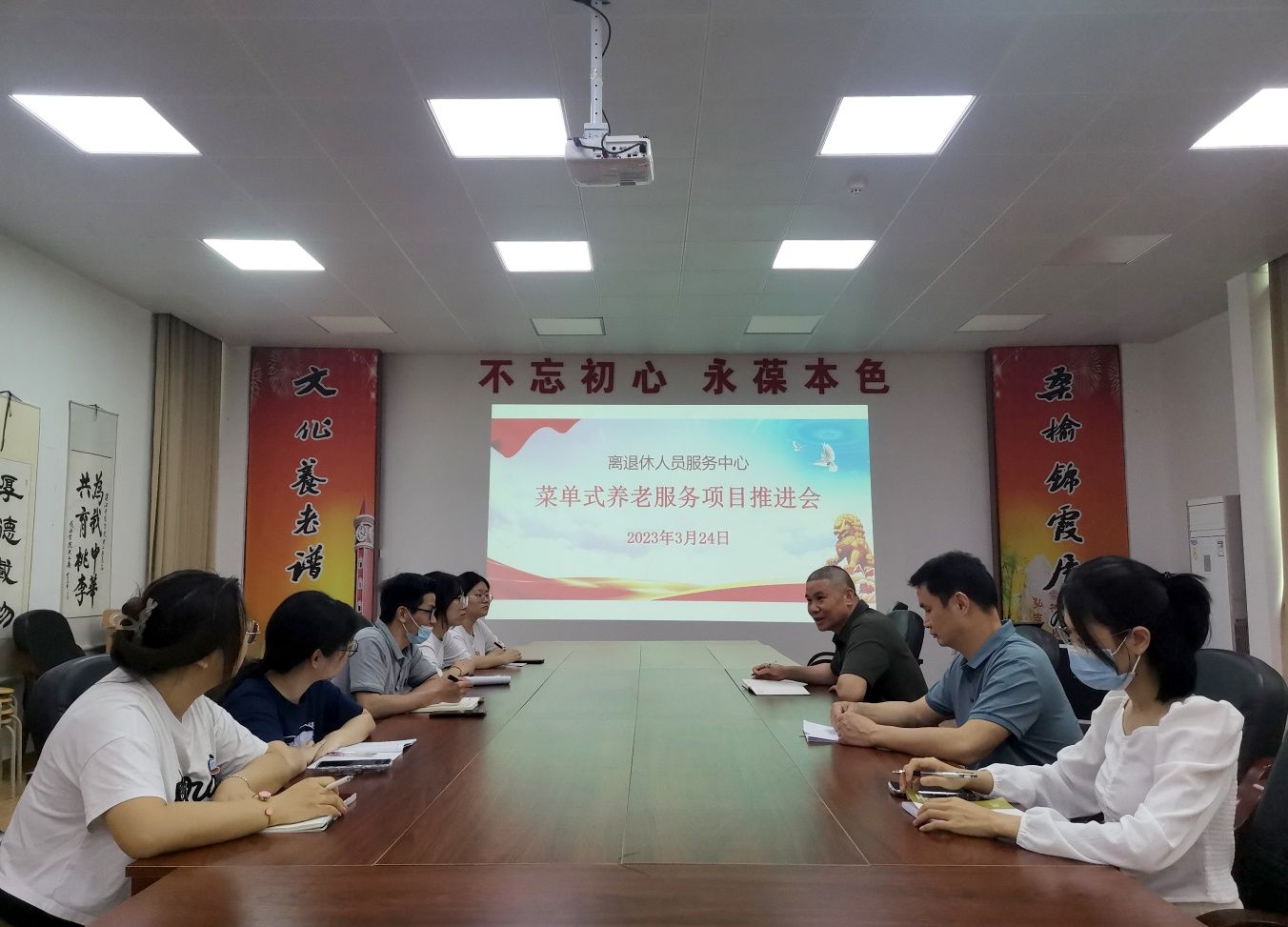 3月24日上午,离退休人员服务中心在离退休会议室召开菜单式养老服务项目推进会,进一步推进菜单式养老服务,提升“燕岭霞光”志愿服务队管理水平,会议由离退休人员服务中心副主任叶德波主持,项目相关负责人和安逸家政公司总经理庄陆炯及运营团队参加会议。