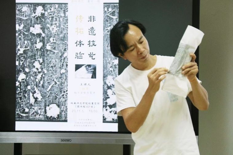 11月5日下午,图书馆举办“非遗技艺 传拓体验”艺术沙龙,特邀拓片装裱修复师杨军,为同学们教授传拓技艺。传拓技艺是用纸和墨及传拓工具将铸刻在器物上的文字或图案捶印下来的一种方法,发明于魏晋南北朝时期,距今已有近2000年历史,被称我国最古老的印刷术,也是非物质文化遗产之一。