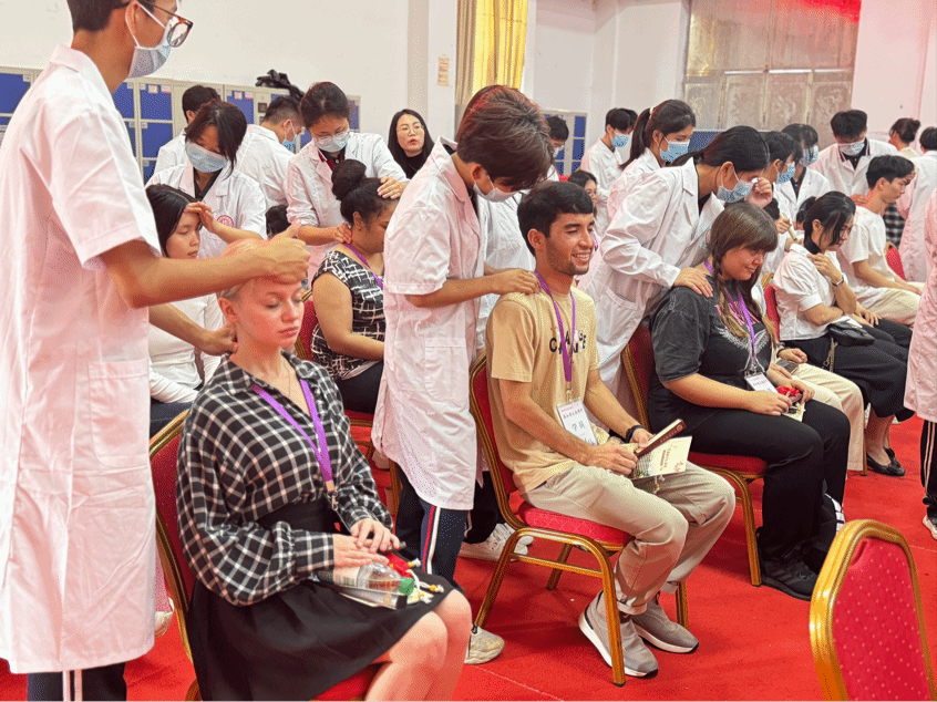 16日上午,国际学生团组一行来到湛江中医学校,参观“天然氧吧”五行中草药园,聆听中医文化讲座,并现场练习《八段锦》。在活动现场的五个展区:中草药辨识区、中药香囊制作区、中医人体穴位辨识区、中医专家把脉问诊区和中医传统疗法体验区,国际学生们逐一浏览。其中,中医传统疗法体验最受欢迎,艾灸、推拿、针灸、刮痧、拔罐等各种传统中医疗法让国际学生们大开眼界,不虚此行。