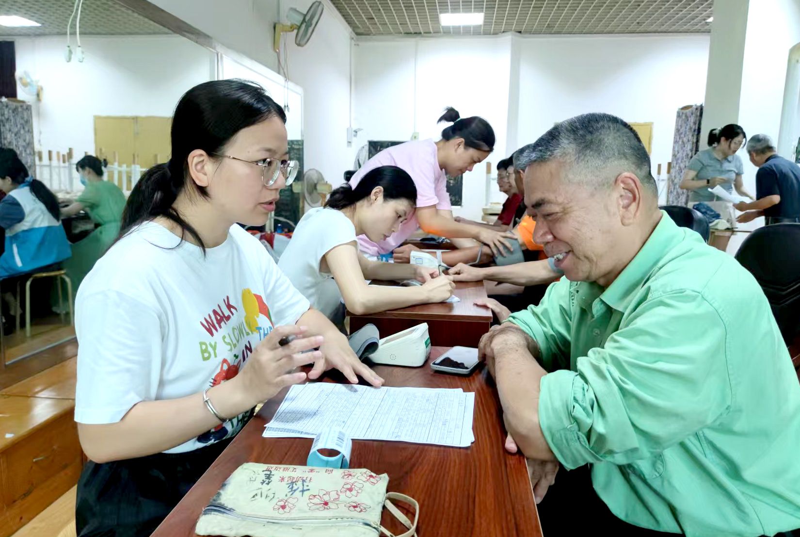 医务人员为老同志进行健康咨询登记现场