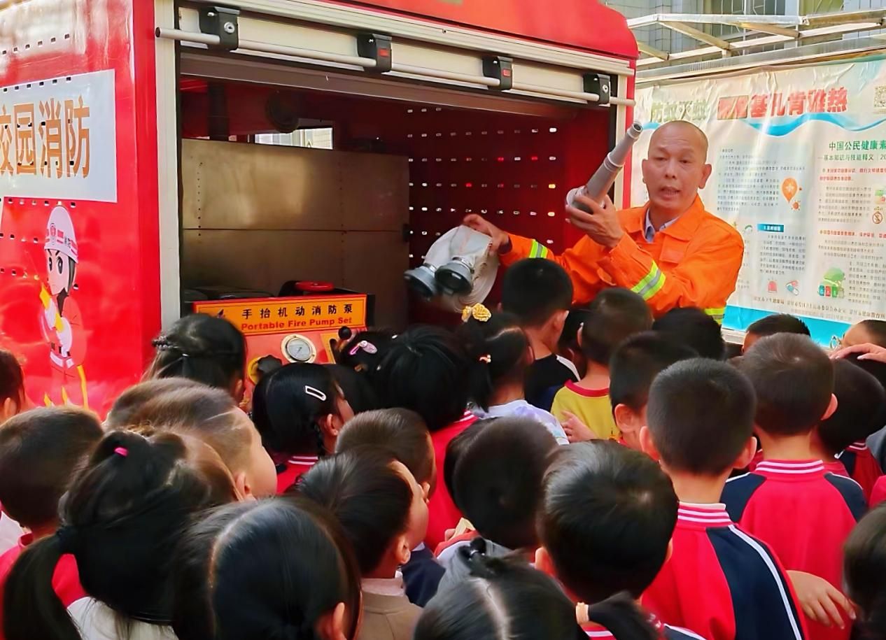 互动环节中,学校安保处安防科李力禹科长携手卡通消防人偶,以问答、情景模拟等形式普及消防常识,“小火快跑、浓烟关门”等口诀让孩子们在趣味互动中掌握逃生技能。实操体验环节,安保人员演示灭火器“提、拔、握、压”使用方法,幼儿园师生分组实操体验,将抽象知识转化为实践能力;师生还近距离参观校园消防车,了解消防设备功能,萌发对消防工作的敬意。