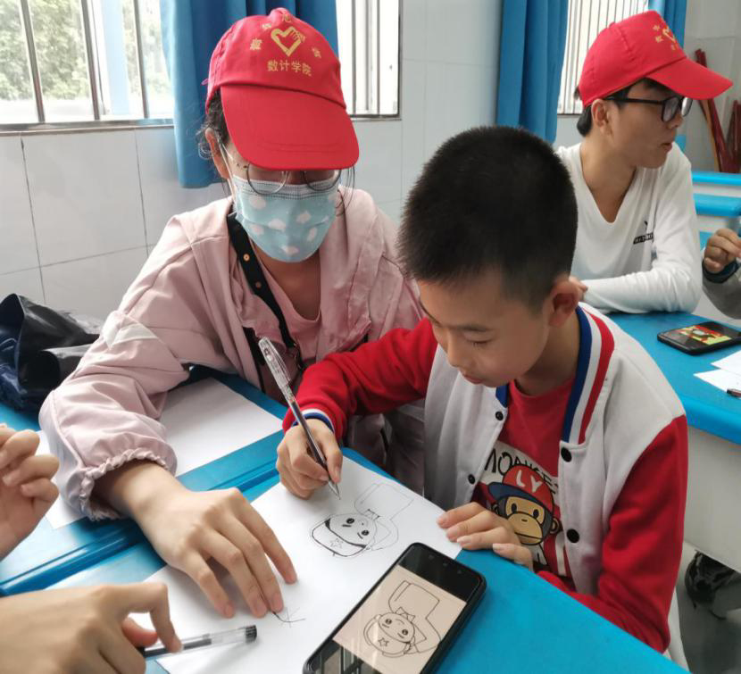 志愿者指导小朋友绘画