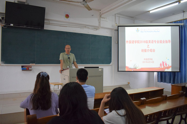 4月14日下午,外国语学院于教三801室举办了2018级英语专业就业经验介绍会,会议由党委副书记杨建伟主持,由17英语4班陈碧兰、17英语3班李祁健主讲,18英语1、2班全体同学参加了此次活动。