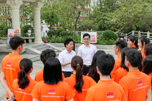 以史鉴今,红色传承。在纪念广场内的谭平山爱国主义教育基地,微党史宣讲课堂徐徐展开。来自数学与统计学院的陈青表同学娓娓讲述:“谭平山曾担任岭南师范学院的前身雷州中学的校长,他是从我校走出去的杰出的革命活动家,他的一生是为党为国奋斗的一生。”来自教育科学学院的黄田秀同学则通过我校学生创作的一幅画作,介绍了广东南路革命运动的发起人之一、老校友黄学增的革命事迹,当听到黄学增为了追求革命理想、牺牲时年仅29岁时,同学们都很动容。这些“身边的红色记忆”,带着在场师生重回那个浴血奋战、顽强不息的光荣年代,在校史人物的故事中汲取前进的力量,赓续红色血脉。
