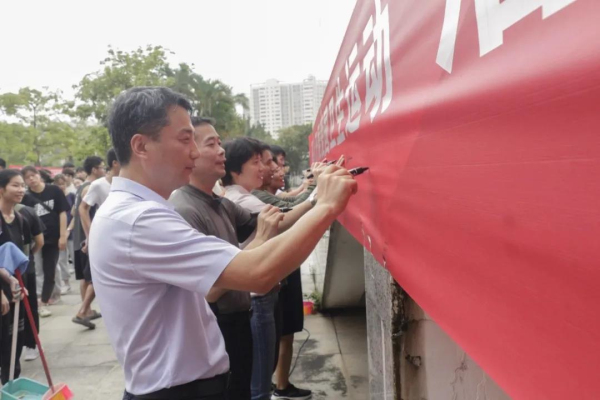 王海涛宣布体育科学学院劳动教育仪式正式启动。老师同学们依次在横幅上进行签名,共同响应劳动教育的活动。