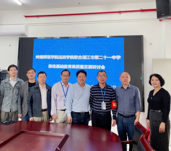 为全力推进《岭南师范学院赋能基础教育高质量发展行动方案》,4月22日上午,法政学院党委书记李德深、副院长娄伟、历史系副主任兰教材、思政系主任谢锦江、辅导员孟玉新等人赴湛江市第二十一中学开展基础教育高质量发展专项调研。本次调研活动以座谈会的形式开展,法政学院一行以及湛江市第二十一中学校长林文明等参加了座谈会。