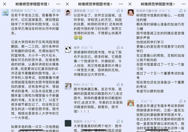 除了线下读者们的积极参与,线上在公众号推文留言处,更是看见读者对图书馆对学校真挚深情的告白,他们或表达图书馆和书籍对他们的帮助、或回忆校园生活点滴温情、或祝福每一位岭师的学子学有所成……温暖的文字带来的正向鼓励与情绪价值,让人动容。