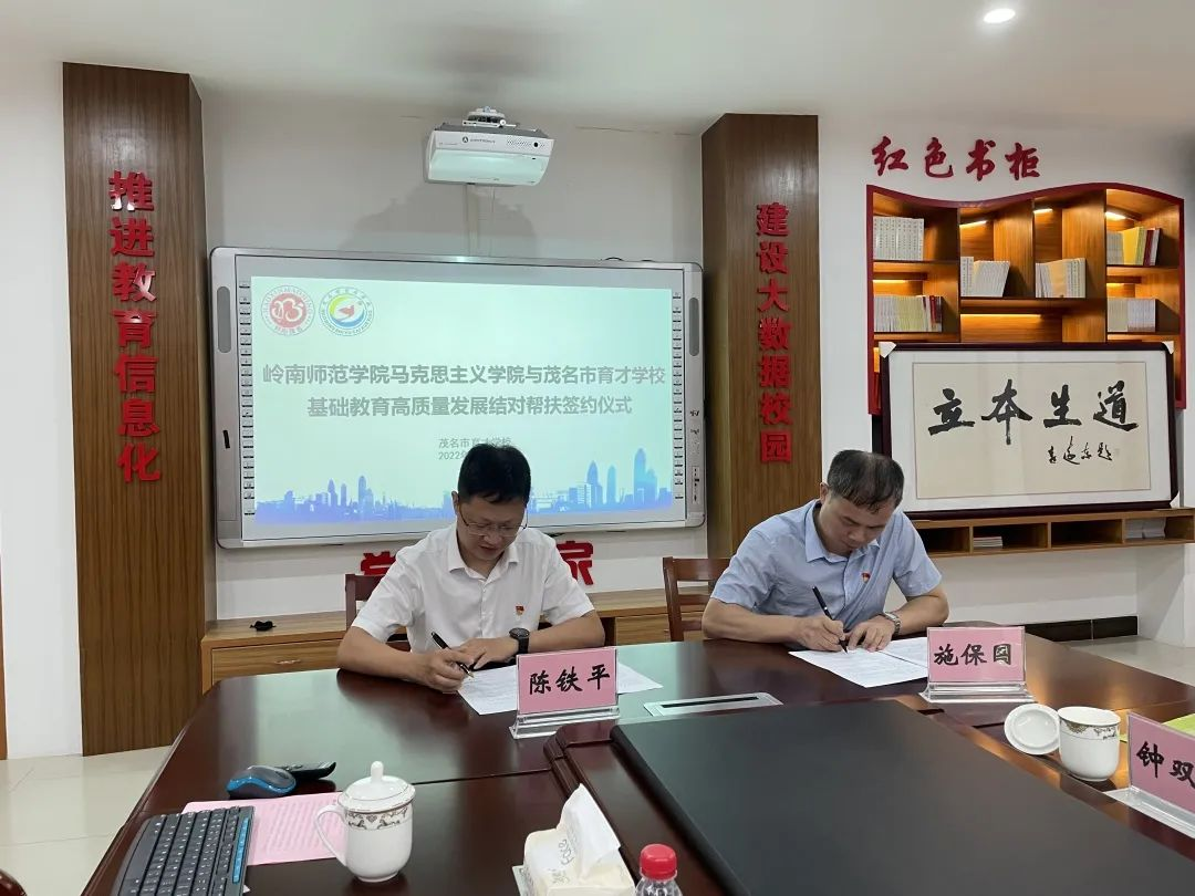 最后,在与会人员的共同见证下,茂名市育才学校党总支书记、校长陈铁平与岭南师范学院马克思主义学院副院长施保国签署了《岭南师范学院马克思主义学院与茂名市育才学校基础教育高质量发展结对帮扶协议》,两校将依据协议约定,携手合作共进,共圆教育梦想。今后五年两校将立足新时代教育改革发展大局,精准发力、精准施策,马院充分发挥教师在科研、党建、教学资源等方面的优势,聚焦育才学校教学改革、特色发展、校本教材编写、师资交流、教研培训等方面提供智力支持和资源条件,把握结对帮扶的契机,共同赋能基础教育高质量发展。
