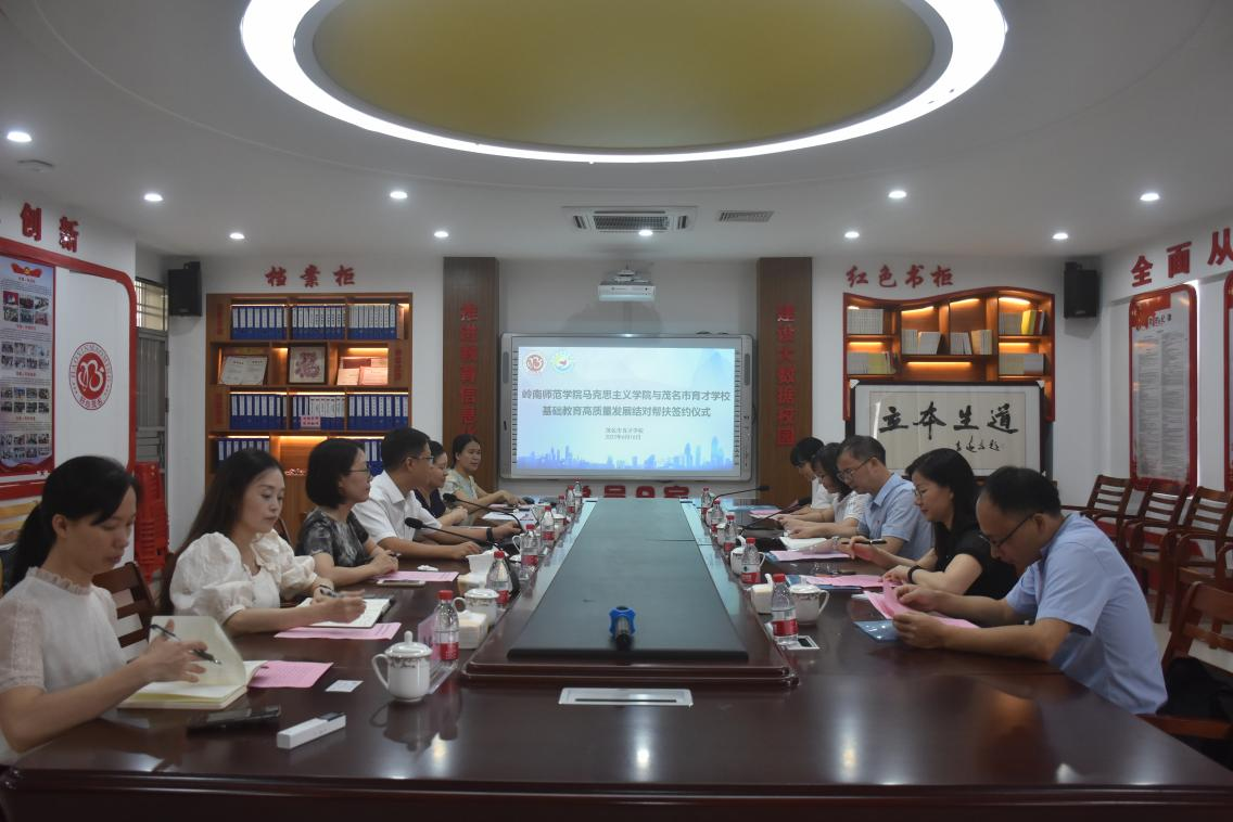 为了深入贯彻落实省委、省政府关于推动基础教育深化改革高质量发展行动方案和《岭南师范学院赋能基础教育高质量发展行动方案》,各二级学院对接若干中小学,全面实施结对帮扶,赋能基础教育高质量发展。6月16日上午,受马克思主义学院院长何增光的委托,副院长施保国带领概论课教研室主任韩小香、纲要课教研室主任伊丽娜、担当与劳动教育教研室主任贺永田、学院办公室主任钟双连一行五人前往茂名市育才学校签署帮扶协议。茂名市育才学校党总支书记、校长陈铁平,副校长陈玲、茂名市教师发展中心继续教育培训部许力衡等参加了活动。