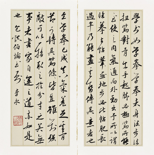 “观其近作,一股学者的文气流淌其间,清刚挺拔、劲健雅洁,兼具经典性和艺术性,行笔骏爽利落,如翩翩轻骑入草原,自有一派俊朗洒脱气象。”这是书法博士李阳洪眼中的李永和他的书法。