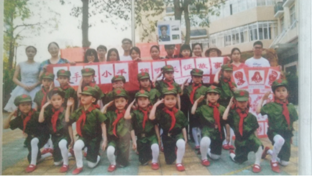 郑光华在2018年3月举行“学习雷锋精神,争当新时代雷锋传人”活动后,师生与校幼儿园小朋友合影