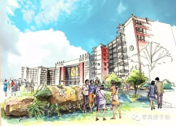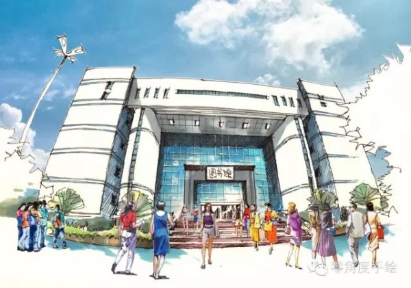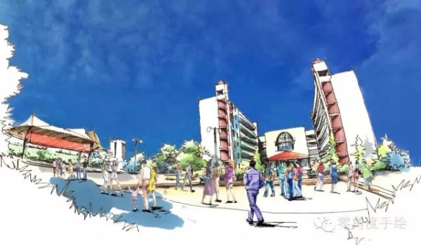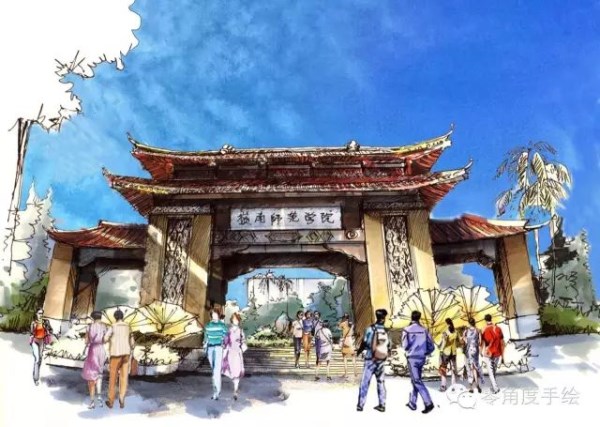 色彩分析——首先,强调一点,为什么天空要用实景呢?一个很简单的理由,熟悉湛江的人,都知道,湛江是一个可以一天之内有四季变化的城市。为了还原与回忆对学校的感情,手绘图的天空一律采用湛江特有的天空色彩。该图主要突出的是光影效果,增加明暗对比,在不脱离原建筑固有色彩的前提下,与天空的真实写照更多了一份新鲜感与夏天的味道。人物的穿梭,增加气氛,起到点缀的作用。