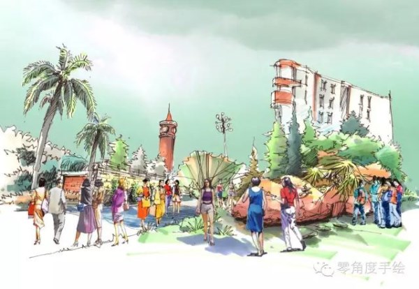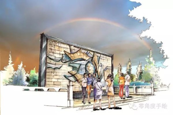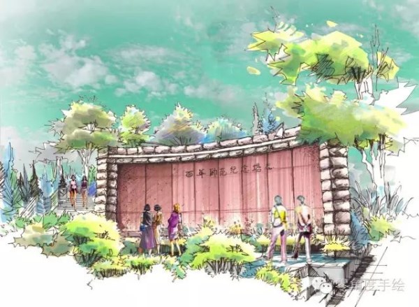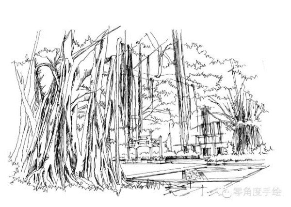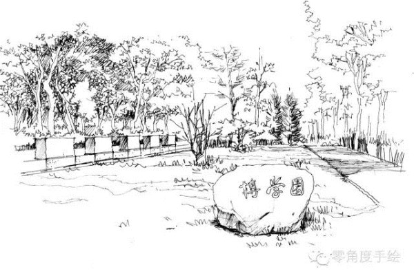 线稿分析——在园林景观手绘图当中,有绝大部分的初学者对于繁杂的树群不会处理的。我们应该懂得对于看到的物体有取舍关系和借景添加到自己的图面当中,这样才会让图显得更加有灵气。在线稿用了比较简练的线条去表现物体的基本形体,而对于远景的植物通过高低疏密的关系让远景产生层次感。