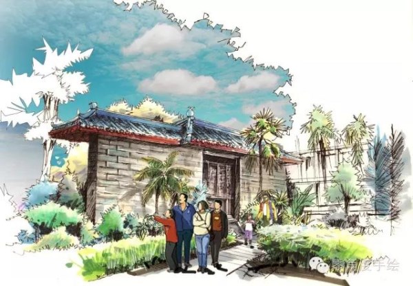 线稿分析——此图采用三点透视,建筑虽小,同样拥有不一般的视觉冲击。在细节的处理,主要在陶壁上,除了主要造型之外,其他的就是疏密,点线面的结合。配景完全是外形概括,点到为止。
