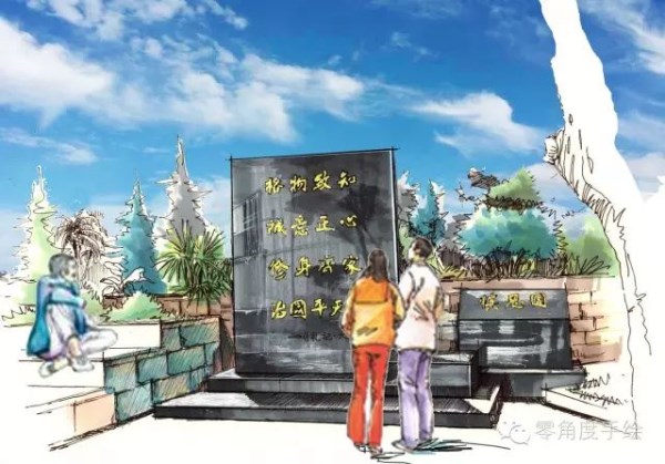 色彩分析——从线稿第一步开始,就没有打算处理过多的细节,计划好在色彩上给予建筑生命力。雕刻着百年树人的石头是此图的亮点之一,能在画面中把远景区分,从色彩的冷暖上,就能把整个距离的空间感拉开。
