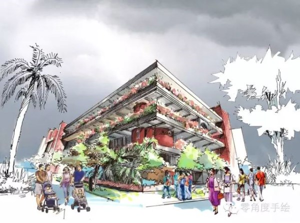 色彩分析——很多时候,线稿的处理能让人联想到色彩的搭配。通过蓝色调,投影与暗部处理,不出五分钟就能衬托整个建筑。外墙玻璃对于天空的倒影,除了为本图增加质感,光感之外,更多的是细节的耐看。白色的物体留白,暗部,投影加重,这是最快速表达建筑主体的方法之一。如果为了增加建筑的喜感,可以选择不同造型的人物为建筑主体服务。