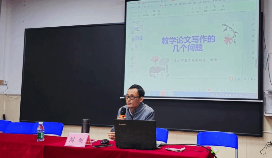 随后,湛江市教育局教研室刘剑老师结合多年教研经验,从选题、理论、框架、格式及投稿五个方面深入讲解了教研论文写作的关键点。他强调,选题要紧扣教学实际,具有创新性和可操作性;理论支撑要合理运用教育理论,确保研究的科学性和系统性;框架设计要结构严谨、逻辑清晰;格式要符合学术规范,避免因细节疏忽影响论文质量。此外,刘剑还对投稿过程中的注意事项、期刊选择、如何提升论文命中率等问题进行了详细的指导,并通过实例讲解了常见的写作误区和改进建议。