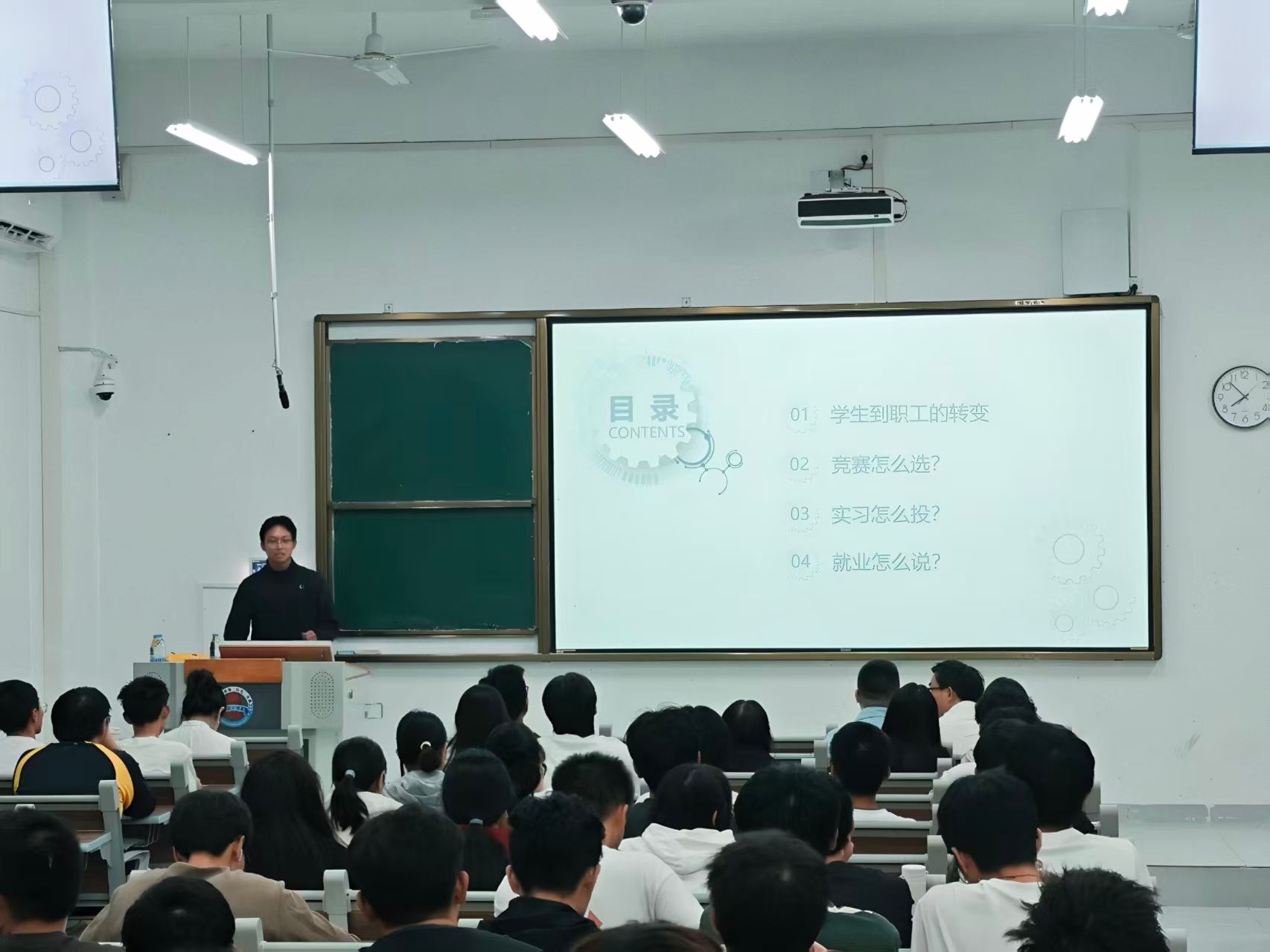 在交流环节,同学们踊跃提问,围绕"专业技术学习""项目实践""职业选择"等话题展开深入探讨。黄伯阳结合自身经历,鼓励同学们积极参与科研项目和技术竞赛,通过实践锻炼提升工程能力,同时保持对新技术的好奇心和学习热情,为未来职业发展打下坚实基础。