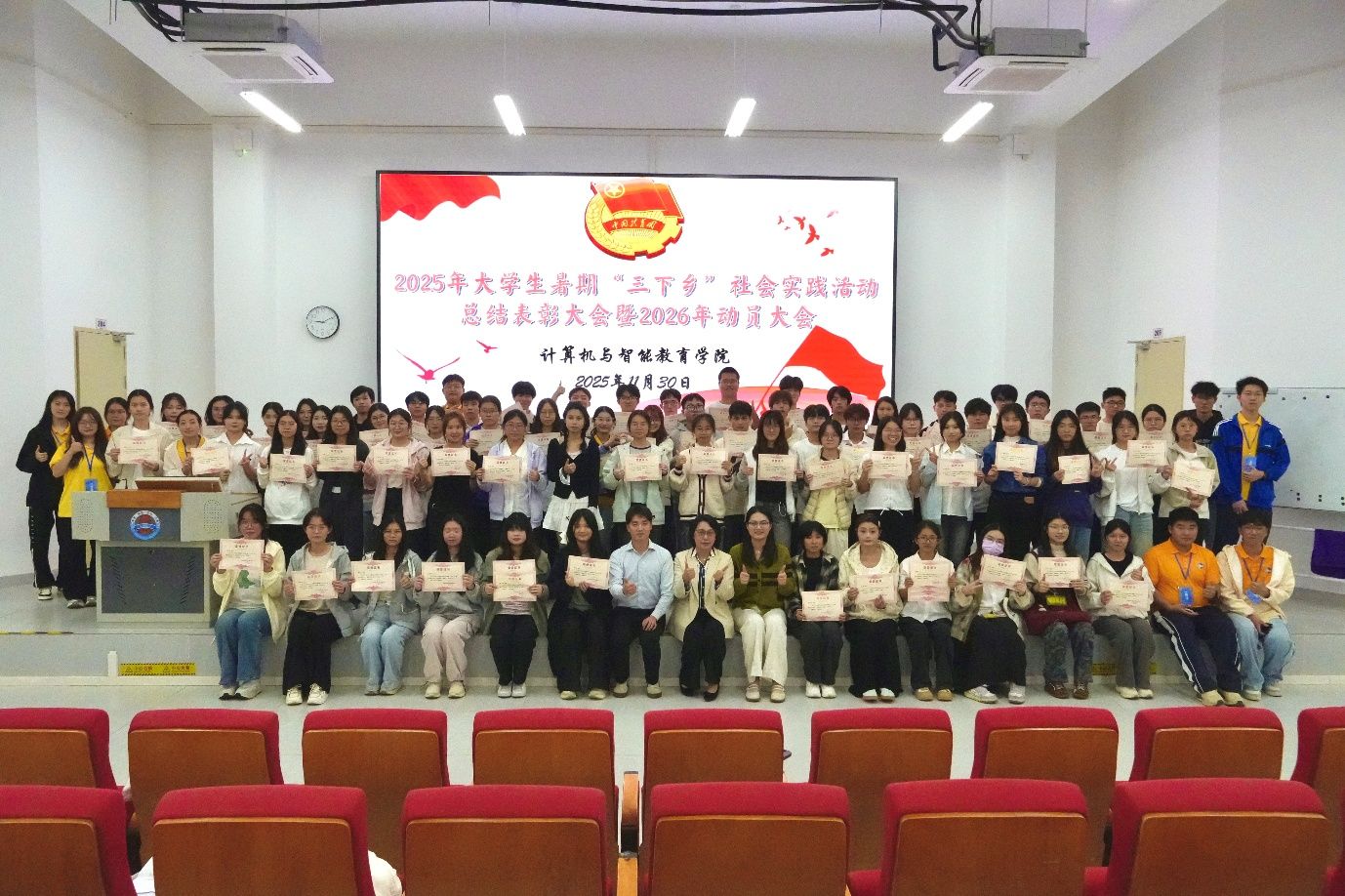 为深入学习贯彻党的二十大精神,计算机与智能教育学院于近日召开了2025年暑期“三下乡”社会实践总结表彰大会暨2026年动员大会。学院党委副书记陈明娟、团委书记韦楚莹、学生会指导老师邓海波出席,2025年“三下乡”社会实践活动队员、2024级及2025级学生代表参加。