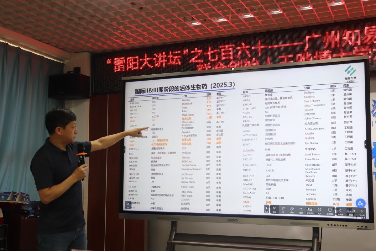 在这次学术报告会中,王晔以自身团队创办的知易生物为案例,生动拆解了活体生物药“以菌为药”的核心逻辑与产业落地路径。他介绍,2013年团队创业之初,国内活体生物药领域尚处空白,团队锚定肠道共生菌的药用转化这一前沿方向,历经多年攻关,成功推动原创新药SK08(脆弱拟杆菌)在2019年获国家药监局(NMPA)批准进入临床——这是中国近十年该领域的突破性品种,目前针对肠易激综合征(IBS)的适应证已推进至临床Ⅲ期。2022年,另一款新药SK10更拿下美国FDA的IND许可,实现国产活体生物药的国际化突破。