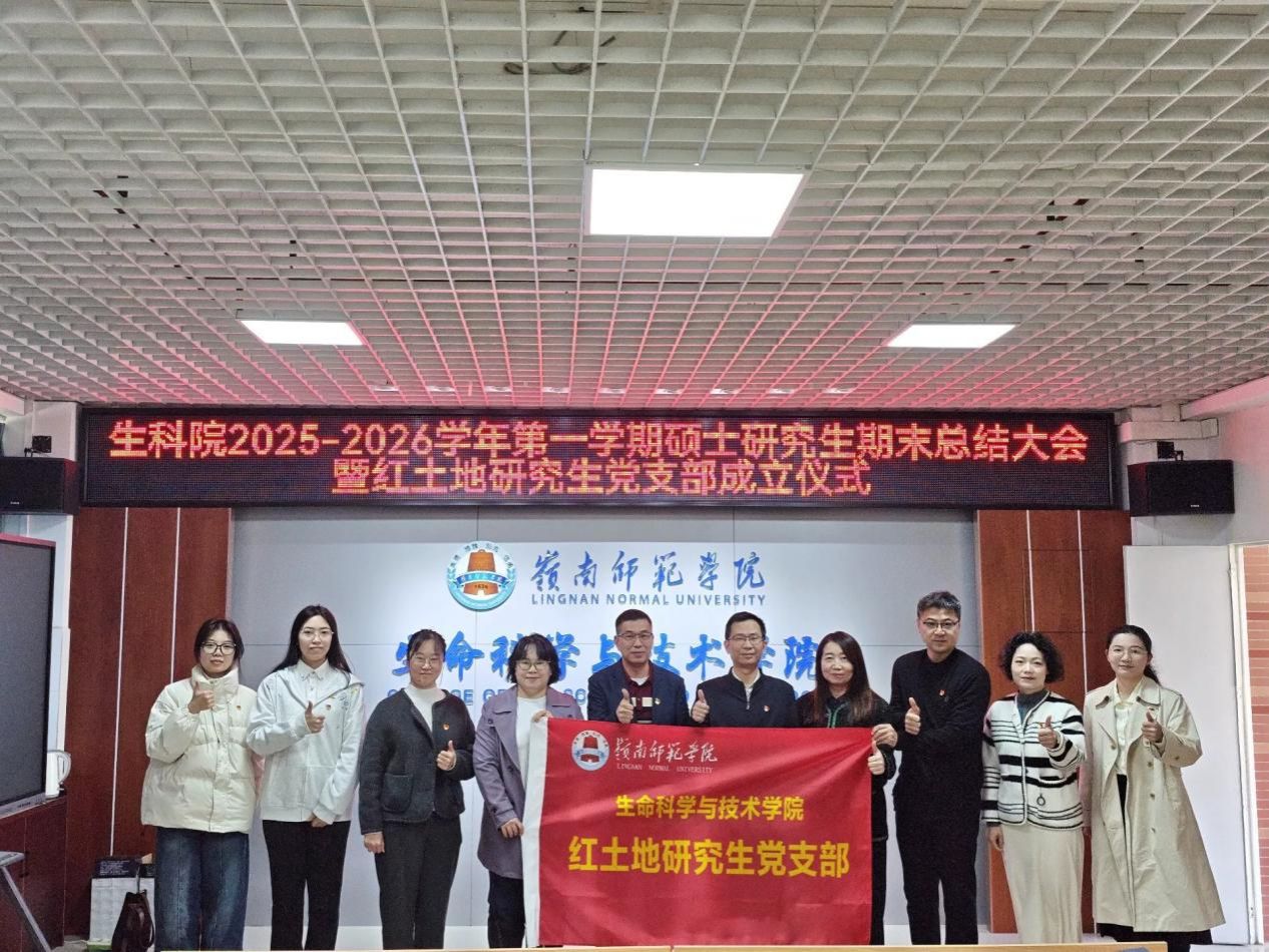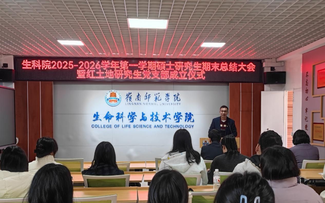 1月9日上午,生命科学与技术学院隆重举行2025-2026学年第一学期硕士研究生期末总结大会暨红土地研究生党支部成立仪式。生命科学与技术学院党委书记李发武,院长刘锴栋,党委副书记覃静君,副院长王锂韫、孙余丹、章晶晶,研究生导师朱胜男博士,辅导员李志钊、梁韫怡,以及生科院2025级全体研究生出席会议。