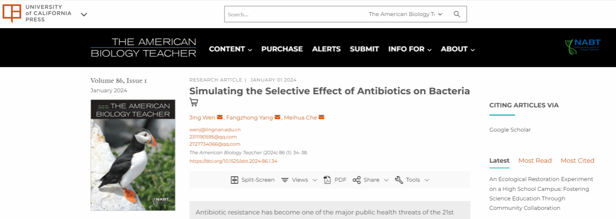 近日,生科院文静老师及其所指导的2020级生物科学专业的本科生杨方忠、车梅华同学,在SCI收录期刊American Biology Teacher(中科院4区)上发表了题为Simulating the Selective Effect of Antibiotics on Bacteria的教研论文。American Biology Teacher是由美国生物教师协会 (NABT) 主办的一份专门针对K-16年级生物教师的专业期刊。
