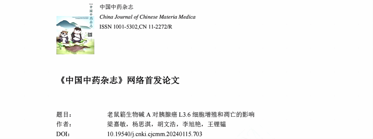 生科院2020级学生梁嘉敏、杨思淇和胡文浩在《中国中药杂志》上发表题为“老鼠簕生物碱A对胰腺癌L3.6细胞增殖和凋亡的影响”研究论文,由李旭艳、王锂韫老师指导,该课题组主要从事中药小分子药理机制研究。