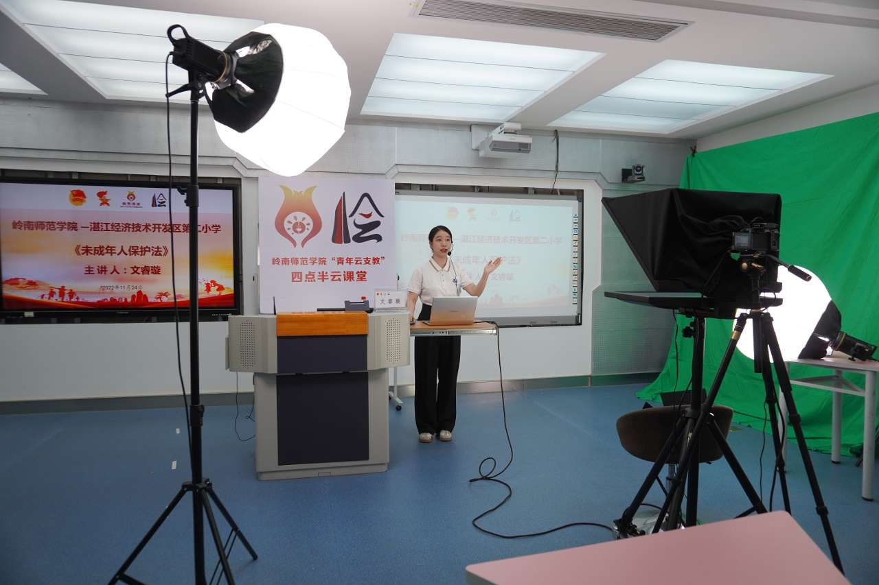 “同学们,你们知道怎么用《中华人民共和国未成年人保护法》保护自己吗?”星期四下午4:30,岭南师范学院(以下简称“岭师”)大学生文睿璇站上“云讲台”,为湛江市经开区第二小学的小朋友们讲授了一堂别开生面的普法课。这是岭师“青年云支教”项目的一个新尝试,每周一到周五,“四点半云课堂”准时开课,通过网络电波和直播设备,岭师大学生为多所中小学校送去第二课堂“云支教”服务。