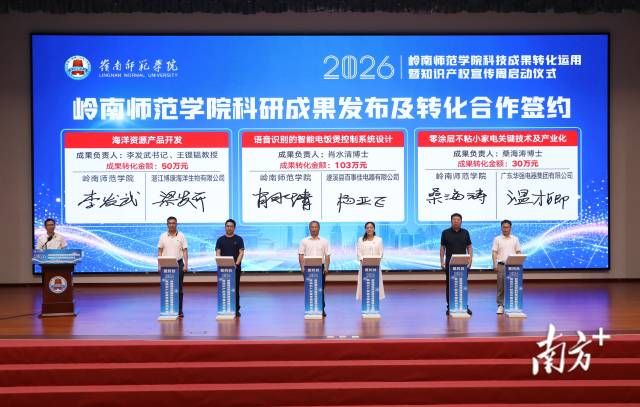4月21日,岭南师范学院2026年科技成果转化运用暨知识产权宣传周在音乐厅启动。现场6项重大成果转化项目集中签约,累计合作金额超293万元;3项专利通过“先用后转”模式落地。