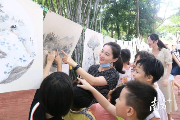 “我也想学这样的画”“我长大了要当一个画家”清新秀丽、雅俗共赏的中国山水、花鸟画让乡村的儿童开了眼界,他们围着学员表达好奇争相提问。来自广州市信息工程职业学校的林纷老师被小朋友围着脱不开身,她现场为小朋友上了一堂生动的美术欣赏课。而在竹林的另一边,小朋友拉着汕头市朝南区职业技术教育中心的楚钊老师在现场示范写生……