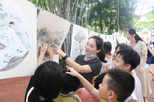 在城家村文化广场上,100多幅具有岭南画派鲜明特色的山水、花鸟画作品用绳子穿插吊挂在树木之间,映衬在成片竹林之中,显得格外的清逸秀美,村民与大批小朋友争相围了过来,一睹为快。