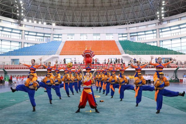开幕式上,岭南师范学院体育科学学院的大学生在现场表演了国家非物质文化遗产“人龙舞”和湛江传统民俗“醒狮舞”,精彩的表演赢得现场经久不息的掌声。