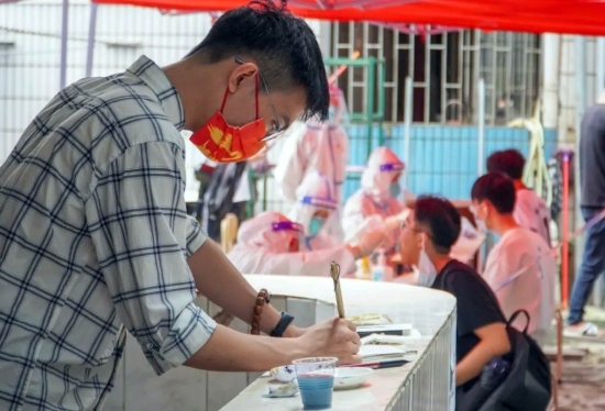“我想用自己的方式,向这些‘白衣天使’致敬。”核酸检测的第一天,金永航就在现场为医护人员画像。金永航观察到,医护人员在核酸检测过程中不断地重复着一个动作,防护服内的闷热让他们的眼眶周围布满了汗珠,汗水流进眼睛后,却无法擦拭,只能通过眨眼来缓解……这些细节深深触动了金永航。