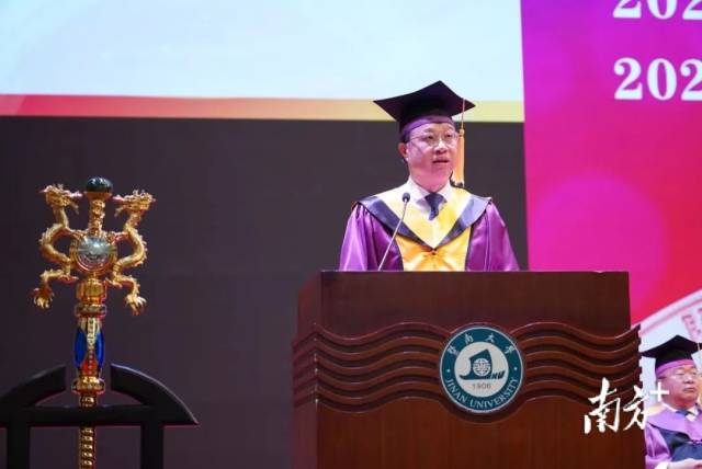 今年,暨南大学的毕业典礼以线上线下相结合方式,在三地五校区同步进行。校长宋献中深情寄语,勉励毕业生“永葆丹心、保持恒心、常怀善心”,要心怀家国情、永存赤子心,心如磐石固、志比松柏坚,心若芷兰香、芳馥清风里。他说,“我始终坚信学生优秀,就是学校优秀!”