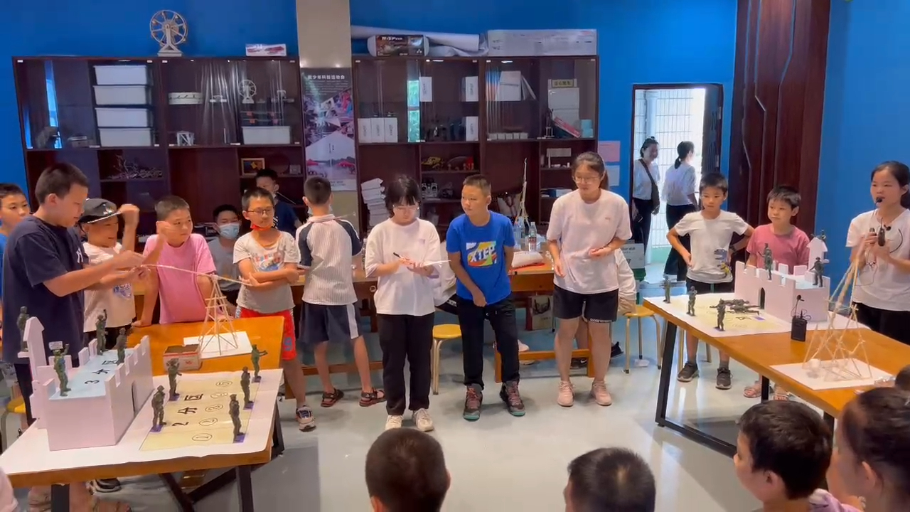 学生们动手制作完抛石机后,在老师的带领下开展抛石机抛石比赛。比赛中,双方屏息静气,紧盯对方阵地,认真计算对方城堡位置并调整方向力度,争取一击命中。现场气氛十分热烈。